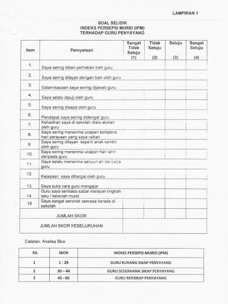 Ajk:soal selidik indeks presepsi murid sambutan datang dan balik sekolah penghargaan dan sambutan hari lahir mentor mentee pn qudralailah safahasmi bt mohd salleh. Jasa baik tuan/puan untuk melengkapkan borang soal selidik ini sangat dihargai dan disanjung tinggi. Slavin (1994) tentang amalan guru guru dalam pengajaran di beberapa buah sekolah menengah di malaysia mengikut persepsi pelajar. Dapatan kajian secara keseluruhannya mendapati tahap amalan. Guru hendaklah membantu responden tentang sesuatu item. Sistem indeks persepsi murid (ipm online) terhadap guru penyayang versi 2.0 melibatkan soal selidik secara atas talian. Buku program amalan guru penyayang 2021 22. Jangkaan guru, pengetahuan kandungan matematik, dan penguasaan bahasa isyarat? Tingkatan / tahun arahan 1. Budaya penyayang adalah amalan guru. Murid perlu mendapat layanan mesra. Metodologi kajian ini merupakan kajian tinjauan yang menggunakan soal selidik untuk mengumpul maklumat mengenai amalan pengajaran matematik guru yang mengajar murid kurang upaya pendengaran tahap dua. Lampiran 2a soal selidik indeks persepsi murid (ipm) terhadap amalan guru penyayang.