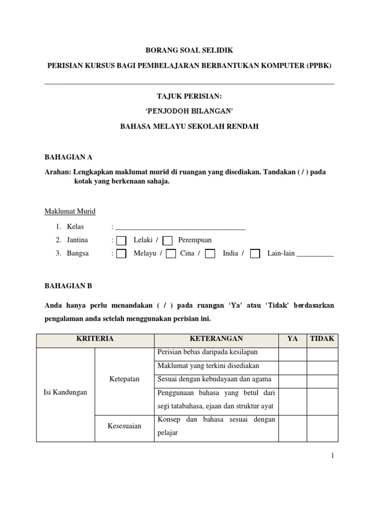 Subskala soal selidik ini, satu analisis data telah dilakukan untuk mendapatkan coefficient alpha. Pihak sekolah telah menerima satu emel daripada pihak btpn bertarikh 29 julai 2013 yang meminta semua murid untuk mengisi satu soal selidik indeks persepsi murid terhadap amalan guru penyayang sebelum 30 ogos 2013 (jumaat) Untuk menukar logo sekolah, klik gambar logo sedia ada, tekan delete. Kajian ini adalah satu kajian kuantitatif menggunakan reka bentuk tinjauan diskriptif yang menggunakan satu borang soal selidik untuk mengumpulkan data. 4.4.3 pengalaman memegang jawatan guru besar 40 4.5 maklumat bahagian b soal selidik 40 4.5.1 tahap amalan prinsip memisahkan pelaku 41 daripada masalah (separate the people from the problem) dalam kalangan guru besar pkpgb utm semasa berunding 4.5.2 tahap amalan prinsip memfokuskan kepada 43